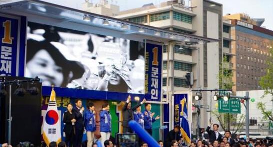 韓國最大在野黨共同民主黨總統候選人文在寅(圖中)在首爾光化門廣場參加競選造勢活動。中新社記者吳旭攝