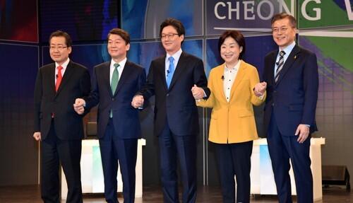 資料圖:左起依次為自由韓國黨洪準杓、國民之黨安哲秀、正黨劉承旼、正義黨沈相奵、共同民主黨文在寅。(圖片來源:韓聯社)