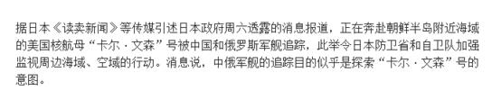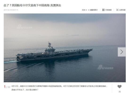 《防務新聞》在報道中稱,在一個多星期以前美國媒體和亞洲媒體還在蜂擁報道卡爾·文森號航母逼近朝鮮半島時期,卡爾·文森號在4月8日離開新加坡南下,4月15日通過巽他海峽前去澳大利亞參加“西太平洋”聯合演習。