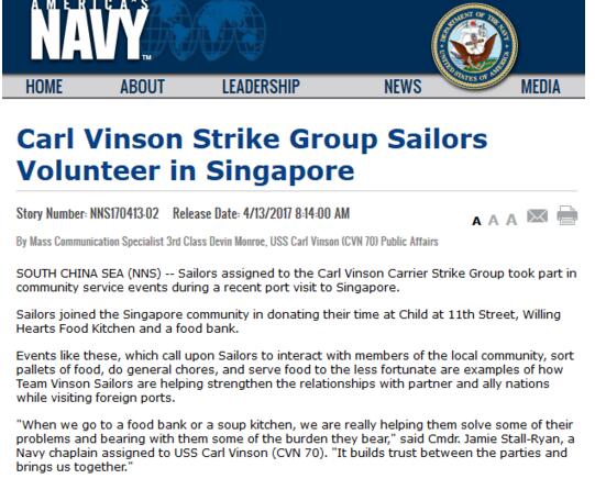 美國海軍官網上卡爾文森號的水兵那時候還在愉快的游覽新加坡的風光
