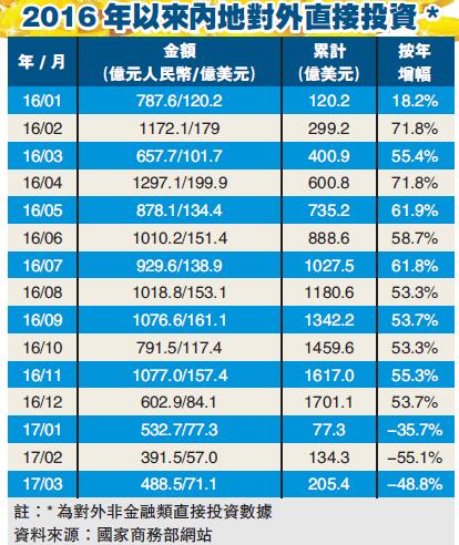 至於2017年全年中國企業海外投資趨勢,商務部新聞發言人孫繼文此前預計為「穩中趨緩、緩中向好」。