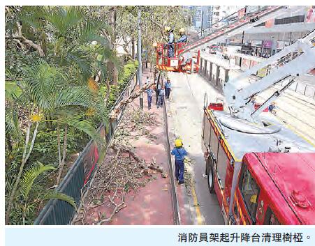 昨日中午12時30分,有途人發現北角英皇道遊樂場內,一棵約10米高大樹伸出公園圍欄外行人路上的樹椏,突然倒塌,跌落英皇道東行線上,當時並無行人經過,否則後果不堪設想。途人通知公園女職員報警。消防員到場後,先將倒塌阻路的樹椏清理,搬上行人路,檢查後架起升降臺,再移走另一節伸出公園外,有潛在危險的樹椏。