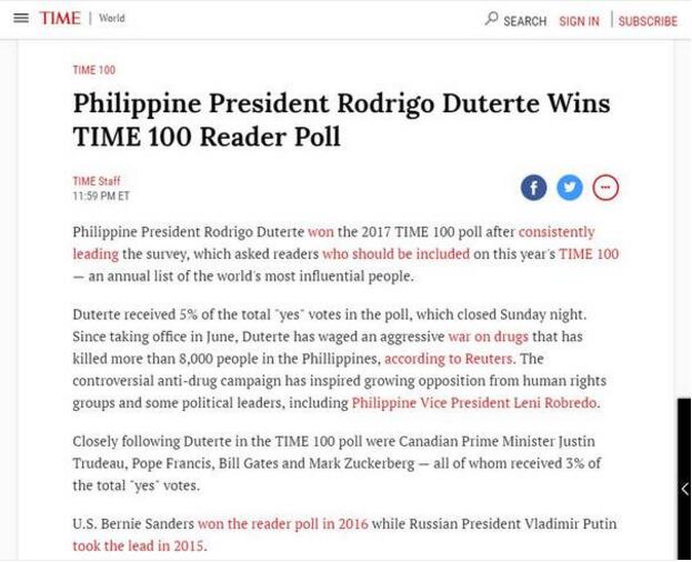 美國《時代》周刊4月16日公布2017年100大最具影響力人物榜讀者票選結果,菲律賓總統杜特爾特獲得5%的讀者投票,擊敗加拿大總理特魯多、教宗方濟各等人,高居榜首。