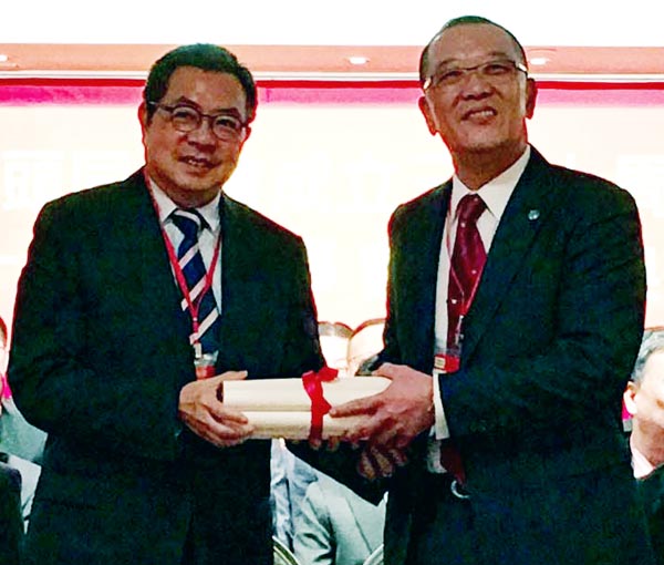 陳幼南(左)頒發聘任證書予會長吳崇南。