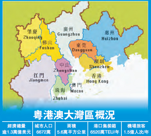 粵港澳大灣區包括:廣州、深圳、珠海、佛山、惠州、東莞、中山、江門、肇慶和香港、澳門兩個特別行政區。目前,粵港澳大灣區經濟規模超過1.3萬億美元,僅次東京灣區的1.8萬億美元,但城市人口高達6672萬,港口集裝箱吞吐量達6520萬TEU,機場旅客吞吐量達1.5億人次,均較東京灣區及三藩市灣區高出不少。其中,香港是該大灣區內最國際化的城市,中央政府預期粵港澳大灣區極有潜力成為世界上最具競爭力的灣區城市群,堪與東京灣區及三藩市灣區媲美。
