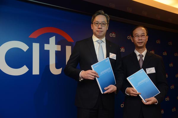 林智剛(左)與花旗銀行市場研究部主管周偉杰(右)昨一起發表花旗銀行香港千萬富翁調查報告。記者蔡啟文攝