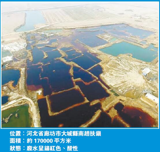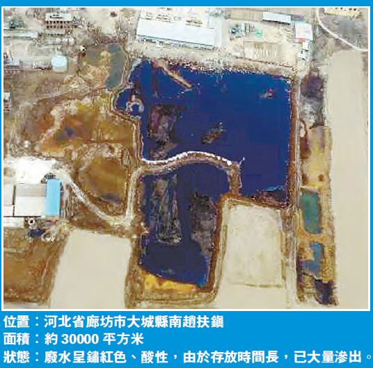 【香港商報网訊】環保部昨日就近雄安地區出現的多處工業污水滲坑一事,聯合河北省現場調查結束,確認污染問題基本屬實,未來將制定整治方案。此前一天,民間環保組織「兩江環保」披露,在河北廊坊大城縣趙扶鎮和天津靜海區內,「潜藏」多處工業污水滲坑,最大一處達17萬平米,約相當於21個足球場地,其中一個距離雄安新區僅60多公里。