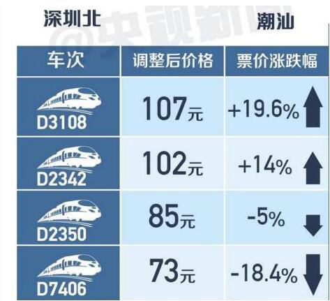 以深圳北至潮汕的高鐵票價為例,調整前二等座執行票價為89.5元,調整后同樣區間,D3108次為107元,漲幅19.6%;D2342次為102元,漲幅14%;D2350次為85元,下調5%;D7406次為73元,下調18.4%。