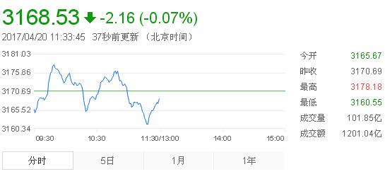 4月20日消息,滬深兩市早盤低開,滬指圍繞3171點平盤線橫盤震蕩。創指早盤有一波小幅拉升,臨近上午收盤指數有所回落。截止收盤,滬指報3168.53,跌0.07%,創指報1844.06,跌0.07%。