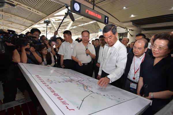 【香港商報網訊】記者葉佩瑜、何加祺江門報道:由行政長官梁振英(CY)率領的粵港澳大灣區城市群考察團,昨日繼續第二天行程。考察團一行一早奔赴廣州南站實地參觀,了解粵港澳大灣區交通樞紐連接情况。下午,又赴佛山、肇慶、江門。其間,CY十分關心日后香港與大灣區多個城市(如肇慶和江門)間的鐵路連接;有鐵路部門人員向他解釋,待日后香港及廣東省內高鐵網建成,港人便可由香港西九龍站乘搭高鐵,并經廣州南站轉到全國各地。