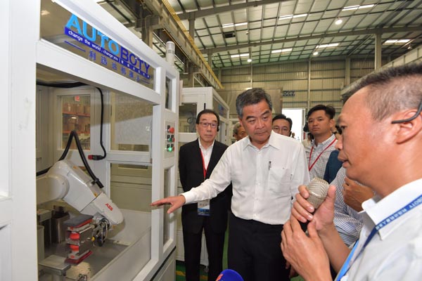 昨早,梁振英與代表團一行在佛山參觀一間應用機械人技術制造公司。