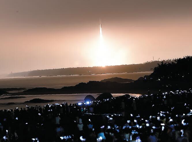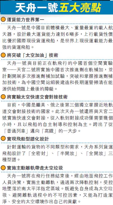 【香港商報网訊】昨天晚上19時41分,搭載著中國第一艘貨運飛船「天舟一號」的長征七號遙二運載火箭,在中國文昌航天發射場成功發射。這是天舟貨運飛船和長征七號運載火箭組成的空間站貨物運輸系統的首次飛行試驗。飛船入軌後,將按預定程序與在軌運行的天宮二號先後進行3次交會對接,3次推進劑在軌補加以及空間應用和航天技術等領域的多項實(試)驗。天舟一號的成功發射,將為中國空間站組裝建造和長期運營解決能源和物資的供給問題。