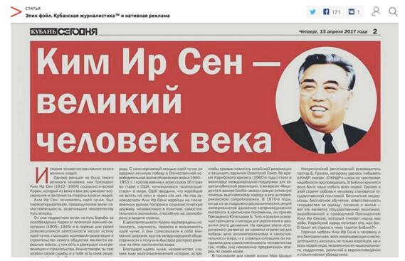 在2016年,《共青團真理報》哈巴羅夫斯克版和伊爾庫茨克版也發布了關于金日成的文章,有時沒有廣告標注,有時候會帶有“材料由朝鮮提供”的標注。俄羅斯南部地區的媒體上也會定期刊發類似文章,因為有不少朝鮮族工人在那里工作。