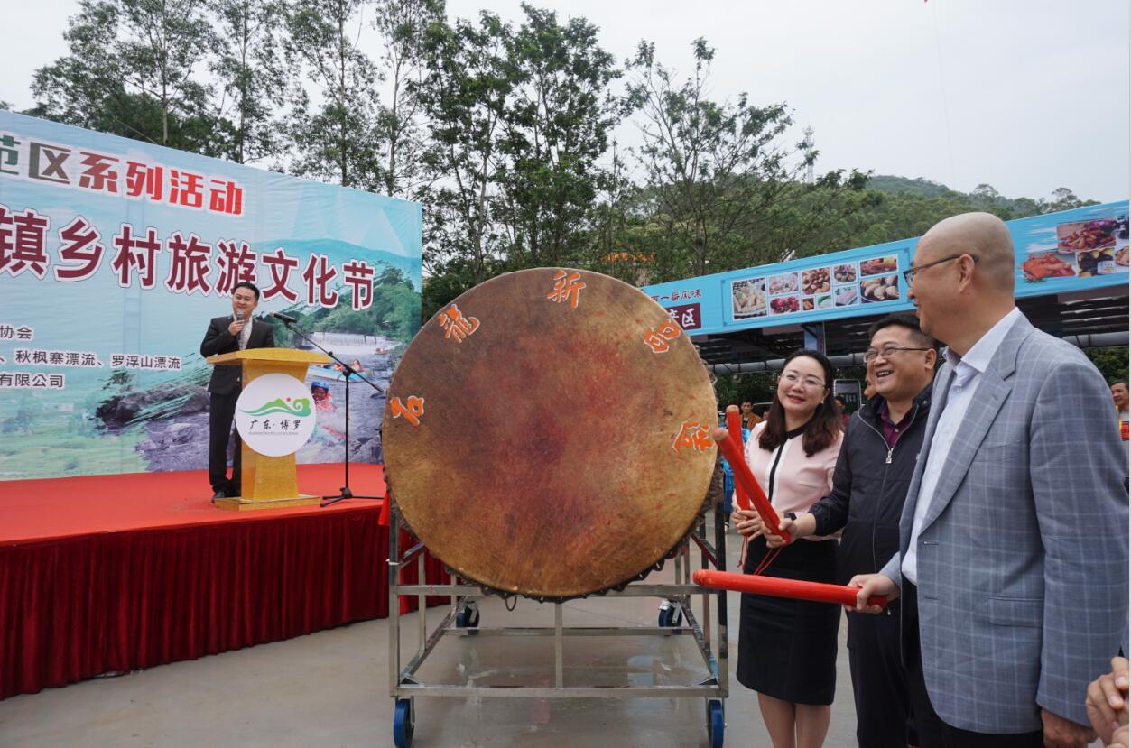 惠州市旅游局局长张莉兰(左)博罗县副县长李林(中)惠州市旅游协会会长曾俊为旅游节敲响大鼓。.