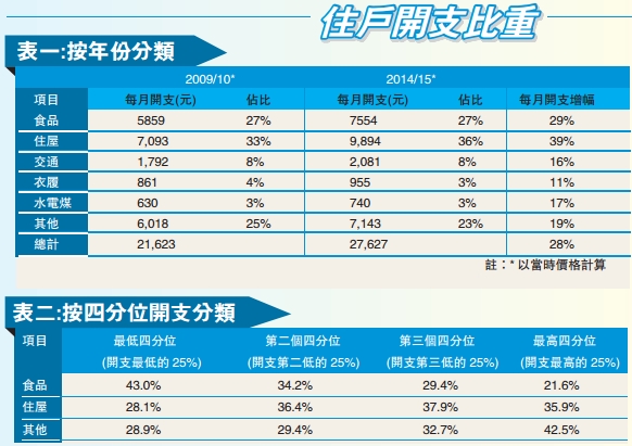表一比較了2009/10年和2014/15年的住戶開支分布。隨着通脹上升,住戶支出難免水漲船高,整體開銷便增加了28%;不過,對比同期收入中位數增長35%,市民荷包理論上應該較前松動了。事實上,縱然社會不時抱怨交通、食品,以至水電煤等年年加價,惟數據顯示,相關開支占總開支的比率并無大變,分別維持於27%、8%和3%,意味凡此種種的加價幅度絕不特別離譜。不過,受累樓價急飆,住屋開支的占比卻由33%升至36%,所涉金額亦增加39%跑贏整體;顯而易見,樓貴租貴才是市民生活捉襟見肘的罪魁禍首,乃至終極禍根。