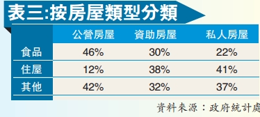 表三正正解釋了箇中原因。以住戶所居的房屋類型劃分,公營房屋住戶的住屋開支,僅僅占了整體開支的12%;當然,公屋租金嚴重脫離市場,幾乎免疫於近年的樓市狂潮,且還動輒獲得派糖免租,所以,無論以什麼方法劃分,公屋住戶的住屋開支占比乃是所有其他群組之中最低的。至於資助房屋的住戶呢,理論上言,這個群組亦獲政府資助住屋開支;然而,數據反映,其住屋開支高占整體開支的38%,這固然大幅高於公營房屋的住戶,實際所涉金額且是后者的6倍之強!更加匪夷所思的是,比較私人房屋住戶的住屋開支占了41%,資助房屋住戶實不見得受惠「資助」而大大減輕了住屋負擔!當然,資助房屋無疑發揮了一定資助作用,缺乏此一福利載體的話,小康生活必然更慘;可是,相關資助幅度實在應予提高,例如爭取將資助房屋住戶的住屋開支占比,降至遠離私人房屋住戶而又高於公營房屋住戶的水平,比方說30%左右。