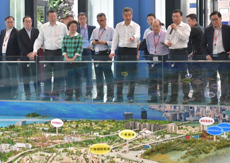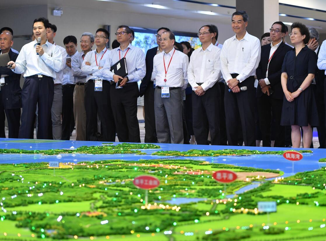梁振英(前排右四)率本港考察團21日參觀中山市翠亨新區規劃館。旁為政務司司長張建宗(前排右三)和財政司司長陳茂波(前排右五)。