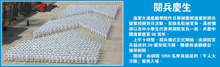 《人民日報》昨日撰文報道引述軍事學術研究員張軍社的話稱,從驅逐艦部隊成立到海軍航空師組建,從核潛艇下水到水下發射運載火箭成功,從航空母艦入列到艦載戰斗機成功起降,海軍已發展為潛艇、水面艦艇、航空兵、陸戰隊、岸防部隊構成的戰略軍種,實現「從近岸防御向近海防御與遠海防衛結合」的戰略轉型。
