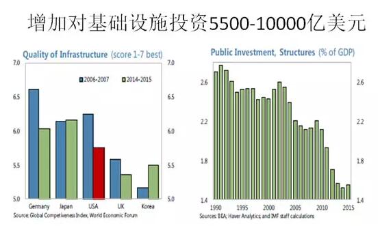 比如說基礎設施,大家可以看到危機以前藍的美國,危機以后美國基礎設施急劇下跌,美國的火車特別慢,紐約到華盛頓走三個小時,我昨天從北京到這兒高鐵兩個小時就夠了。美國國內對基礎設施的投資從三十年前的占GDP的2.8%,跌到今天的1.4% ,導致了基礎設施老化下降,所以確實對基礎設施投資有需求。