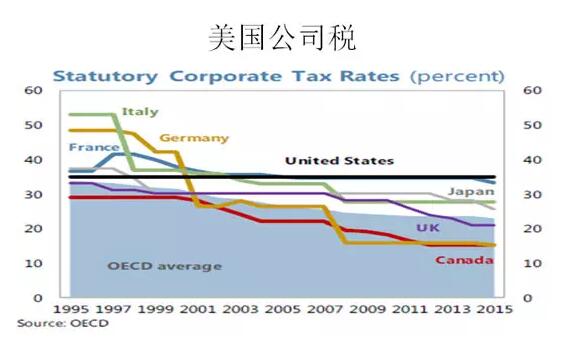 公司稅,趨勢總體是由高往下走,因為公司稅具有國際競爭的原則,公司稅下降10個百分點,可以增加10到15個點的利潤,誰不到你這里設廠?全世界的公司稅都在下降,藍區從二十年前的32%跌到22%左右,跌了十個百分點。我們在座的有愛爾蘭大使,愛爾蘭的公司稅是最低的,加拿大的公司稅15%左右,美國35%。美國要把公司稅降下來也是有想法的,所以它的這些政策,貨幣改革,寬財政都會做,貿易仗也會打,特朗普這個人最大的特點就是不靠譜。