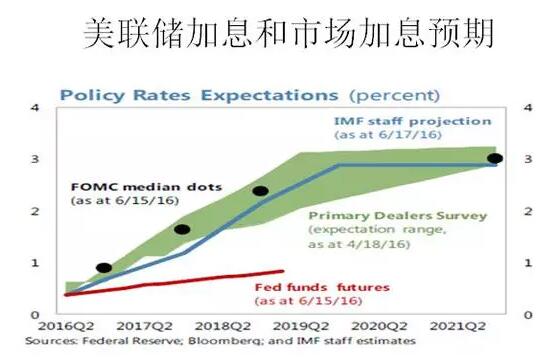 一、美聯儲開始加息,這個是可能加息的軌跡,比如說到2021利息加到3%左右,這個綠的是美聯儲可能的曲線。但是這個市場從來不相信美聯儲會如此強烈的加息,市場的預期是紅線,黑的點和紅線有一個巨大的差別,這就是我們說的風險。為什么市場不相信美聯儲,因為美聯儲在過去從來沒有實現承諾,2015年美聯儲加息,加了一次沒有反應,2016年美聯儲加息市場沒有反應。最終紅的曲線要向美聯儲的曲線靠攏,這個為什么重要呢。因為全世界的資產根據這個紅線,這個紅線的運動會改變全世界的經濟。要把美國寬松貨幣政策放緩,引起了全球的金融市場的巨大的波動,資本流回美國,匯率大跌,理論上來說這句話動了什么,動了那根紅線,動了市場預期,把這根線往上移了,特朗普的政策又一次改變了紅線,這根紅線會往上移。我們只是不知道這根紅線以什么速度和強度往上移,如果是緩慢進行市場調整,如果是急劇的波動全球金融市場的波動,全球金融資產的再配置不可避免。這個是影響當今世界最大的一件事兒。