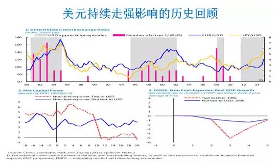 特朗普強勢美元,美元太強。我把美元的走勢,美元兌歐元,日元的走勢,發生金融危機的國家放在一起了,所以說右邊的指標衡量,這邊紅的最高八個國家發生了金融危機,大家可以看到美元走強的第一個時期是八十年代,在那個時期發生了很多國家的金融危機,拉美危機,拉美危機以后美元走弱,又一次走強走到九十年代。這一次又有很多國家發生危機,這是亞洲金融危機,美元走強為什么世界會發生金融危機呢?因為美元走強,企業就必須用更多的美元負債,美國的資本會流回美國,市場會發生恐慌,這就是在拉美危機八十年代亞洲危機,九十年代實實在在發生的事情。到現在為止美元走強還沒有達到亞洲和拉美的危機,美元會繼續走強。因為特朗普的政策以及美國經濟的趨勢,因為美聯儲的利率政策,但是我在后面講到,比起美元不斷走強,更麻煩的是美元波動。