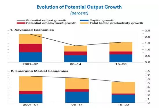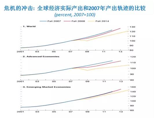 2010年全世界金融危機以后,全球經濟增長的速度一直緩緩的下降,今年到了3.3%左右,但是仍然處于低位,為什么全球增長會處于低迷狀態,這是因為全球金融危機沖擊的影響遠遠超過我們的想象。這個藍的線是07年全球GDP的,紅的是我們做的調整的預測,黃的是實際的結果,危機是把全球經濟的GDP水平平行的下壓到了一個低的水平。這個缺口就是我們世界永久性損失掉的因為危機產生的缺口,1929年以來全球危機以來,反彈超過以前的軌道,第一次經濟的水平遠遠低于原有的柜機,增長能力也在下降,我們做了預測,全球經濟的潛在基礎生產能力藍的增長能力,紅的勞動的增長能力,投資在下降,老齡化勞動力,增長速度在下降,所以未來五年潛在的勞動經濟增長速度也在下降,所以危機的影響是在靜態的經濟水平壓低了,把增長的勢頭給減慢了,這是我們今天面臨的一個大的基本的結構,我們處在一個低的增長水平,低貿易增長,低油價,低利率,低通脹。這個是我們今天面臨的全球的一個大的基本格局。
