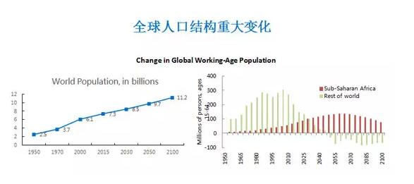 在這個之下全球發生了一系列很有趣的問題。老齡化是一個典型的變化。我舉個例子,美國的例子,一百個人中,今年美國是22個老人,十年以后就會增長到32個,從32%增長到33%,這個速度增長是巨大的,經濟增長速度放緩,老人的費用錢從哪里來,這是全世界面臨的一個共同的問題,問題還在這個,全球不斷在很多國家面臨老齡化,全球勞動力結構的急劇,我們可以全球人口是不斷增長的。今年全球人口是75億,我們2020年是120億,全球人口發生巨大的變化,這個藍綠的柱子,包括美國,日本,中國,綠的柱子,新經濟國家,勞動力供給的高峰恰恰是2008年,往后逐漸是下降,出口勞動人員的負增長,一邊是急劇的勞動力缺口,負增長,一邊是大量的勞動力增長,怎么辦呢?誰承擔在非洲的年輕勞動力的教育,誰給這些年輕的非洲人教育?