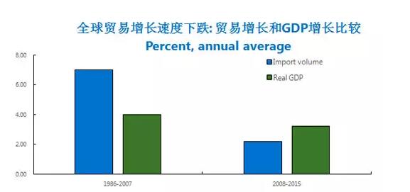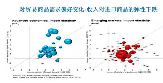 有人說可以移民,但是今天一百萬移民就把德國經濟搞的如此的混亂,二十年以后一億的移民會對這個誰產生什么沖擊。從這張圖的意義上來說,崛起只是剛剛開始。經濟學沒有任何辦法,第一個是人口結構的變化,第二個是需求偏好的變化。這是一個巨大的變化,貿易增長速度在下降,這個藍的增長速度,綠的是GDP的增長速度,以前是GDP永遠高于貿易增長速度,但是危機以后是低于貿易增長速度的,降關稅,產業開始成熟,最有意思的是人的需求偏好發生了變化,這是很有意思的事情。