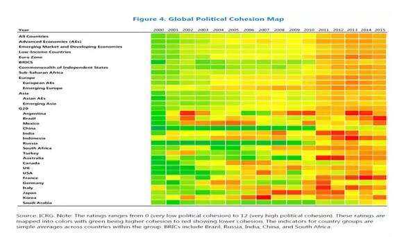 所以民粹主義崛起。這一次民粹主義不斷上升,而且和二戰以前有很大的不不同,二戰以前在德國和意大利,這次英國,美國,意大利,法國,西班牙,荷蘭,涉及面更廣,民粹主義的崛起是我們今天面臨的全球政治的不穩定的拐點民粹主義的崛起意味著國內的政治生態的惡化。我們做了一個分析,我們用綠的顏色,表明是和諧的,淺綠到淡綠,黃到淡黃,淺黃,到桔紅到紅是極度的不和諧,2000年以前,世界上所有的國家是綠的,僅僅十五年以后,今天沒有一個國家是綠的,國內政策和諧的改變根本上改變政治生態,改變了關于地緣政治,我們講的是中東,以色列和阿拉伯的沖擊,伊拉克和阿富汗,今天最主要的沖突是國內社會的不安定,歷史告訴我們國內社會不安定最終回引起國與國的沖突,國內政治不安定的因素急劇上升和諧度的下降是全球政治形勢的拐點。所以我們面臨一系列的拐點,正在走向一個新的世界,這就是結構性的變化和這些推動結構性進一步的變化引導著我們走向一個未來的新的世界。那一定是一個不確定的世界,當然會有無數的波動。