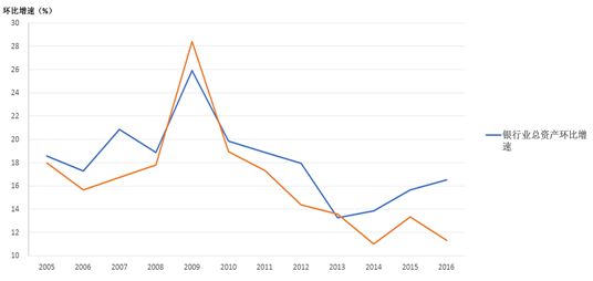 如果以銀行的總資產來替地廣義貨幣供應量,可以看到不一樣的結果。從理論上來說,一個國家的商業銀行的總資產可以約等於所以的貨幣總量。從下面這張圖可見,2013年之後,銀行總資增長速度和廣義貨幣供應量增長速度這兩條曲線出現了裂口,尤其是2015年以後,銀行總資產增長速度往上走,M2繼續往下走,二者之間的差距拉大。