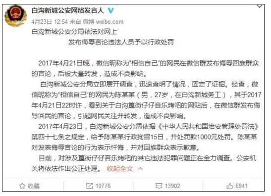 白溝新城公安分局立即展開調查,迅速查明了情況,固定了證據。經查,微信昵稱為“相信自己”的網民為陳某某(男,27歲,在白溝新城務工),其于2017年4月21日22時許,看到關于白溝簋街仔仔音樂烤吧的網貼后,在微信群發布侮辱回民的言論,引起網民關注并轉發,造成不良影響。