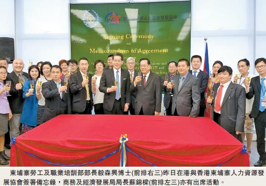 柬埔寨勞工及職業培訓部部長毅森博士興昨日在港與香港柬埔寨人力資源發展協會簽署備忘錄,委託該會推廣、短期培訓、及協調本港外籍傭工中介公司。商務及經濟發展局局長蘇錦樑亦有出席活動。協會主席廖永興表示,現時柬埔寨人的平均月薪是153美元(折合約1200港元),香港外傭月薪最低4310港元(約550美元),在東南亞屬最高,料會吸引不少具海外工作經驗的柬埔寨家庭傭工來港。