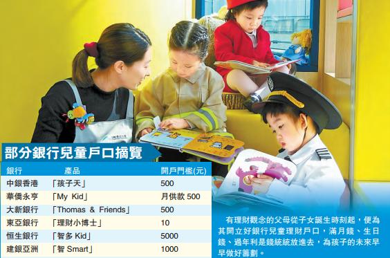 在競爭日趨激烈的今天,理財專家倡導理財規劃越早開始越好,這令「理財,從小朋友捉起」之風潮大行其道。如今,不少家長在銀行為自己的子女開設兒童理財戶口,用孩子的利是錢、零花錢等賺取利息,為未來鋪路。經比較,在本港銀行中,存款期12個月的兒童理財計劃中,年利率最高可達1.6%,2年更高達2厘;至於開戶門檻則由10元到5000元不等。香港商報記者 王理琪