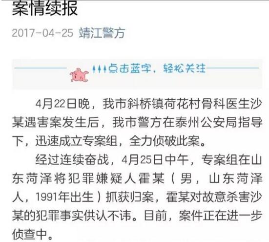 據靖江警方:4月25日中午,專案組在山東菏澤將犯罪嫌疑人霍某(男,山東菏澤人,1991年出生)抓獲歸案,霍某對故意殺害沙某的犯罪事實供認不諱。目前,案件正在進一步偵查中。