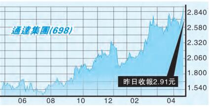 近期手機股勢如破竹,隨着大部分內地手機品牌推出更多金屬機身的旗艦手機型號,通達集團(698)料可持續帶動集團的訂單收入,近期股價在成交配合下破頂,值得望多兩眼。