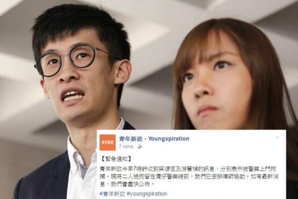 青年新政早上在社交網站facebook上表示,今早7時收到梁頌恒及游蕙禎的訊息,指兩人分別被警察上門拘捕,現時兩人被拘留在灣仔警察總部,已安排律師協助。