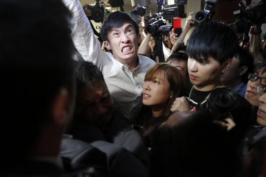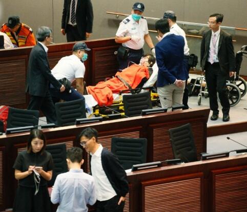 沒想到的是,會議轉場開會僅約近一小時,至下午約1時,之前聲稱不會再闖會議室的游梁卻“反口”再沖擊,大批保安上前阻止,雙方在門外糾纏約15分鐘,期間有4名保安受傷,其中兩人暈倒,香港立法會報警處理,主席梁君彥指因門外沖擊持續,宣布休會,下周再續。