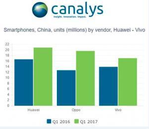 同時,Canalys的數據顯示,中國這一世界上最大的智能手機市場依然保持了增長狀態。今年第一季中國市場智能機出貨量達1.14億台,同比增長9%。華為、OPPO和vivo三家廠商雖然競爭激烈,但它們的位置已經相對穩固,三家廠商拿下了超過50%的市場份額。