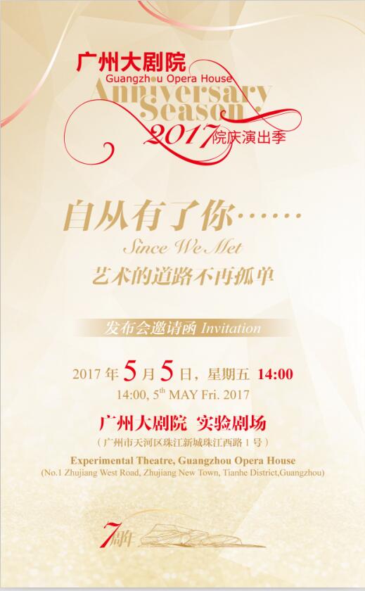 在廣州大劇院七周年院慶演出季期間,十場精彩各異的演出,跨越五、六兩個月,來自七個不同國家和地區,涵蓋了音樂、舞蹈、戲劇、戲曲四種類別,還有十余場演出相關的精彩藝術活動,帶你走進藝術殿堂,領略名家經典。在5月初舉辦的主題為“自從有了你”2017院慶演出季發布會上,廣州大劇院將特別邀請到藝術家、觀眾、媒體以及員工代表,與各界人士一同分享“自從有了你”--廣州大劇院成立七年間,他們與劇院的故事,引發討論“藝術對城市產生的影響,給生活帶來的變化”。
