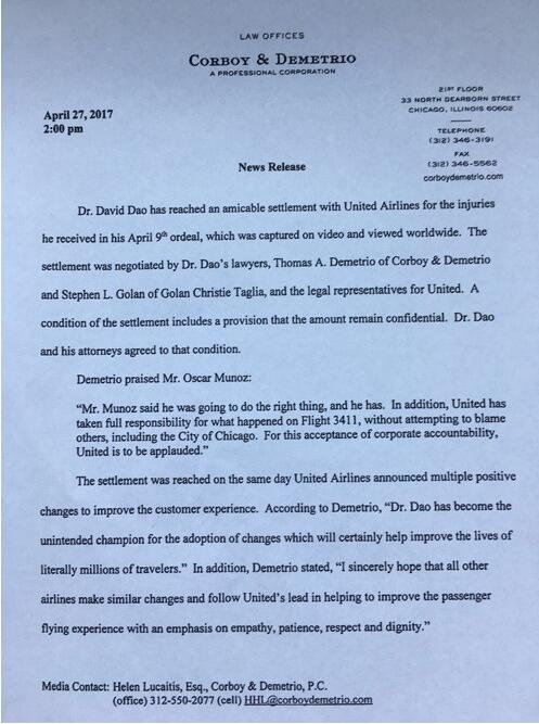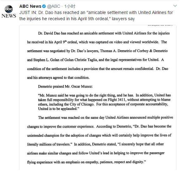當地時間4月27日14點(北京時間28日凌晨3點),負責代理美聯航暴力拖拽乘客下飛機一案的律師德梅特里奧給包括央視記者在內的媒體發來郵件,稱美聯航已與遭暴力拖拽下飛機的乘客David Dao(陶大衛)達成和解協議。但作為條件之一,協議的具體內容和涉及的金額保密。
