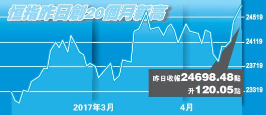 法國總統選舉暫時明朗化,朝鮮政局問題亦有所紓緩,恒指昨日終於突破上月21日創下一年半以來高位24656水平,最高見24717,但大市仍以個別板塊作主導,內銀、內險及有業績支持的國際金融股有資金吸納,對指數有所貢獻。