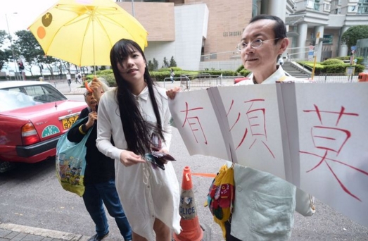 游蕙禎約一時乘的士抵東區法院門外,身穿長身白色裙的游蕙禎,未有紮起頭髮,被法院外的大風吹得披頭散髮。身後有兩名支持者,分別舉起「比卡超」造型的黃傘,以及「莫須有」紙牌,高呼「開會無罪」。游蕙禎連聲說「唔該晒」後,步入法庭。