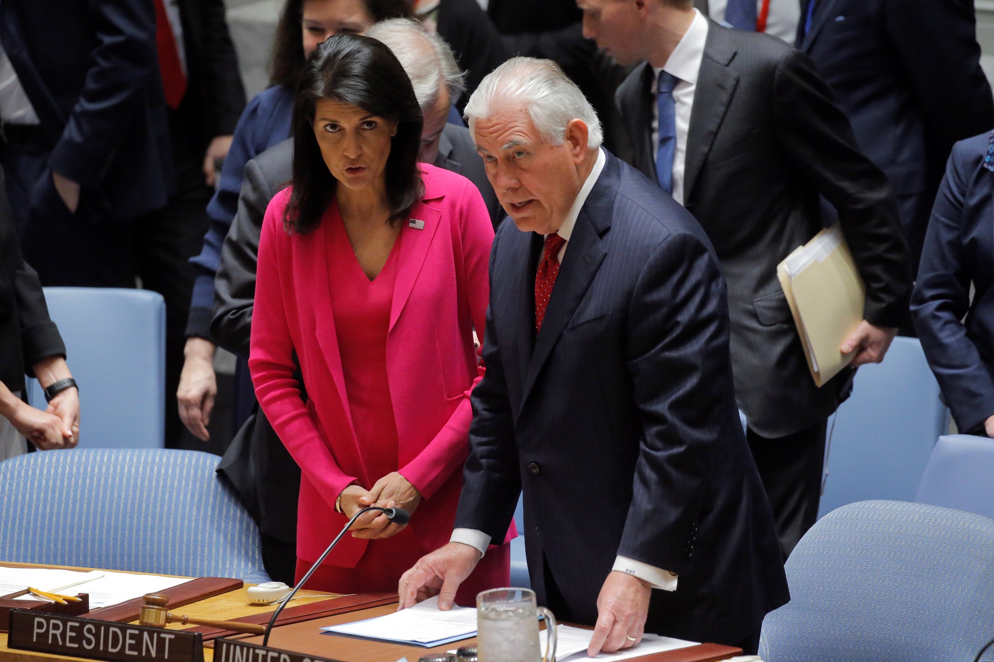 美國務卿蒂勒森(右)认为,有必要强化对朝鲜经济制裁并使其外交孤立。