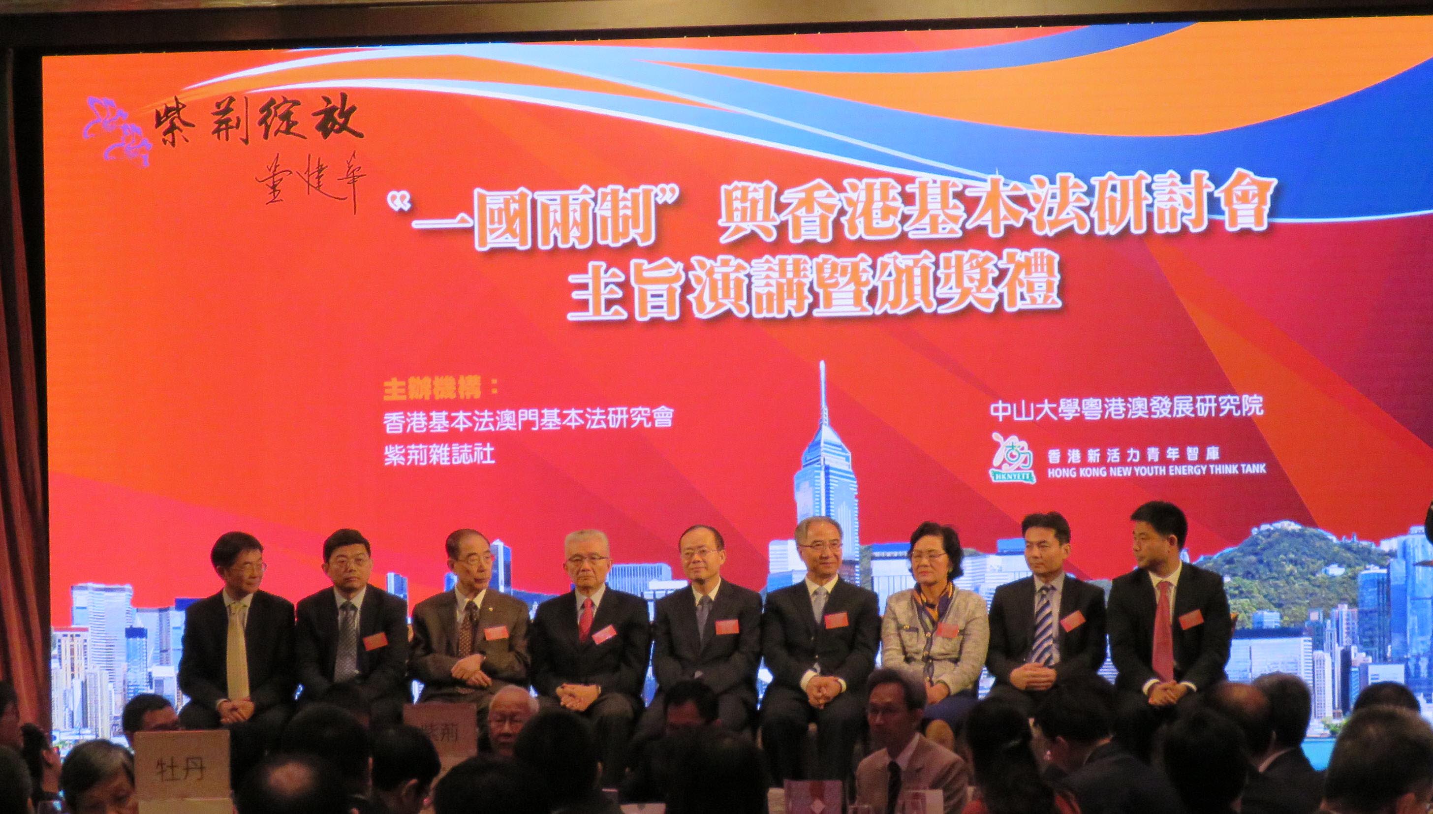由《紫荊》雜誌社等機構舉辦的「一國兩制」與香港基本法研討會,昨日在尖沙咀喜來登酒店舉行,多位嘉賓出席,包括中聯辦副主任楊健、前港澳辦副主任徐澤等;會上有多位嘉賓分享,分析「一國兩制」、《基本法》在香港的落實。