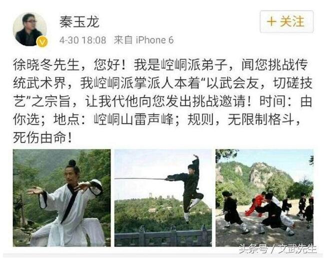 繼陳氏太極拳王戰海老師應戰后,六大門派之一的崆峒派弟子秦玉龍,也在微博上回應。其聲稱是崆峒派掌派人讓其代發挑戰邀請,且戰書相當勁爆:「徐曉冬先生,您好!我是崆峒派弟子,聞您挑戰傳統武術界,我崆峒派掌派人本著『以武會友,切磋技藝』之宗旨,讓我代他向您發出挑戰邀請!時間:由你選;地點:崆峒山雷聲峰;規則,無限制格斗,死傷由命!」。要知道,崆峒派七傷拳可是在武俠界聞名已久。同時,在武術聯盟微信群中,黃雲中律師負責發布稱楊氏太極拳傳人向徐曉冬發出挑戰。