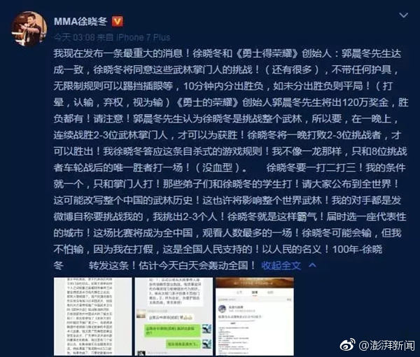一時間,由格斗教練徐曉冬引發的這起爭端,進入白熱化,中原武林儼然即將上演一場「血雨腥風」。而徐曉冬也於昨日凌晨在微博發布「重大消息」將同意各武林掌門的挑戰。徐曉冬稱,比武仍舊不帶任何護具,無限制規則,可以踢襠、插眼,10分鐘內分出勝負,如未分勝負則算平局。暈倒、認輸、弃權均視為占輸。