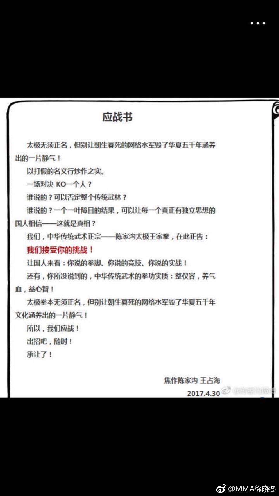 面對挑戰,中原武林同仁紛紛響應,江湖上各名門正派均有弟子躍躍欲試。被徐曉冬點名約戰的太極實戰家王戰軍、王戰海兄弟率先應戰。王家太極總會秘書長曹熙敏公開向媒體證實陳式太極拳第十二代傳人、太極拳世界冠軍王戰海將派出師門六十五徒弟陳前應戰。4月30日,@陳家溝微博發布了,陳家溝王戰海先生的「應戰書」。焦作陳家溝王戰海應戰書中稱:「太極無須證明……我們接受你的挑戰!」