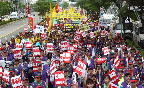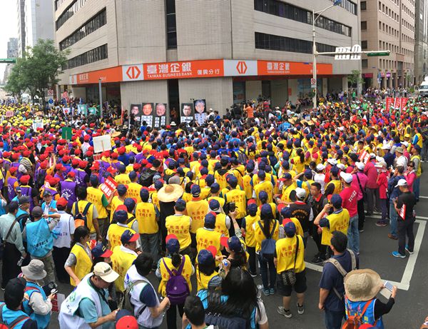万名劳工高举标语,游行前往资方团体大楼。中央社