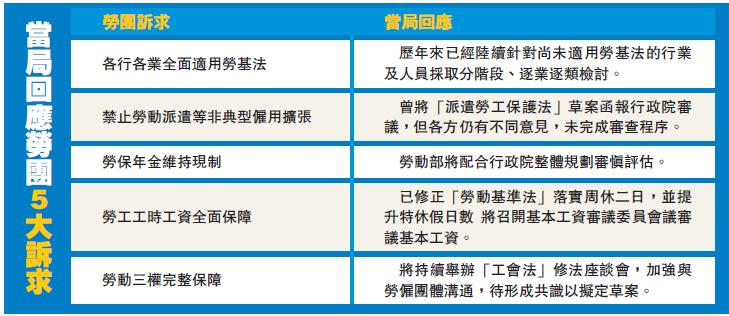 劳团在凯道向当局重申5大诉求,希望劳权得到完整保障。中央社